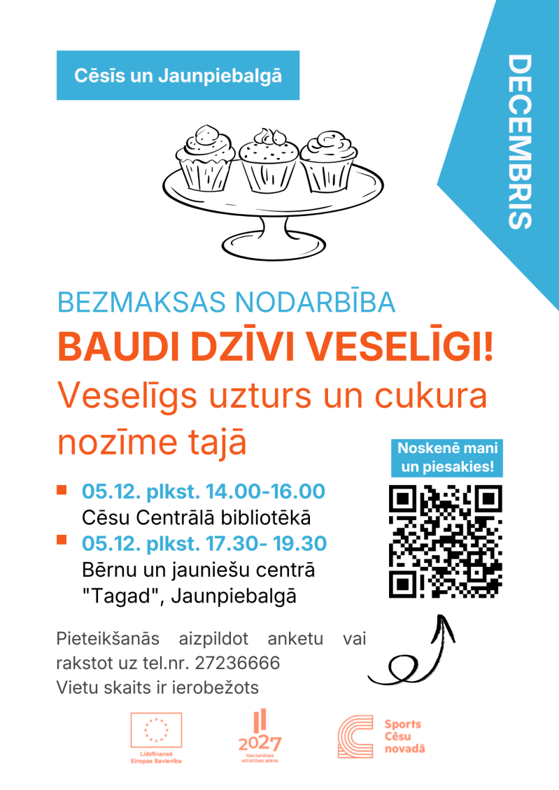 Aicinām piedalīties bezmaksas nodarbībā “Baudi dzīvi veselīgi”, kas norisināsies 5. decembrī plkst. 17.30–19.30 Bērnu un jauniešu centrā “Tagad”, Gaujas ielā 4, Jaunpiebalgā.