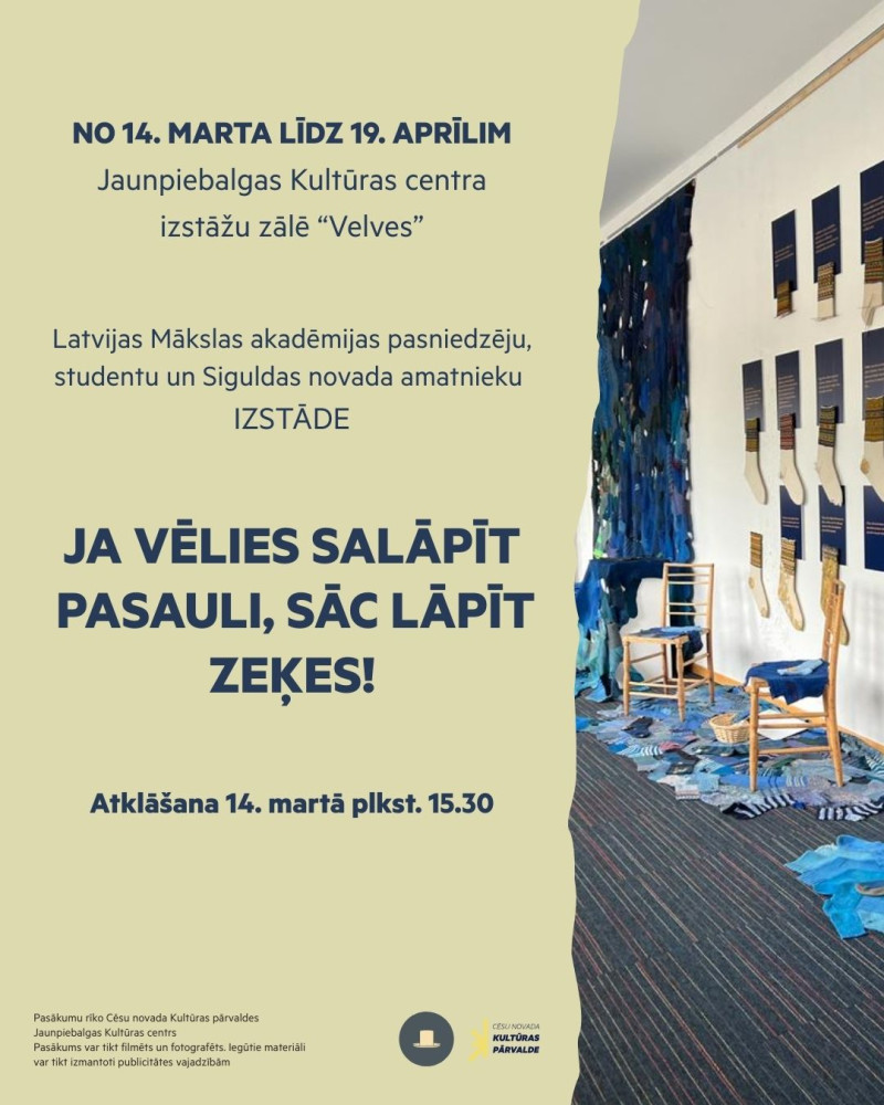 No 14. marta līdz 19. aprīlim Jaunpiebalgas Kultūras centra izstāžu zālē “Velves” būs apskatāma Latvijas Mākslas akadēmijas pasniedzēju, studentu un Siguldas novada amatnieku izstāde “Ja vēlies salāpīt pasauli, sāc lāpīt zeķes!”.
