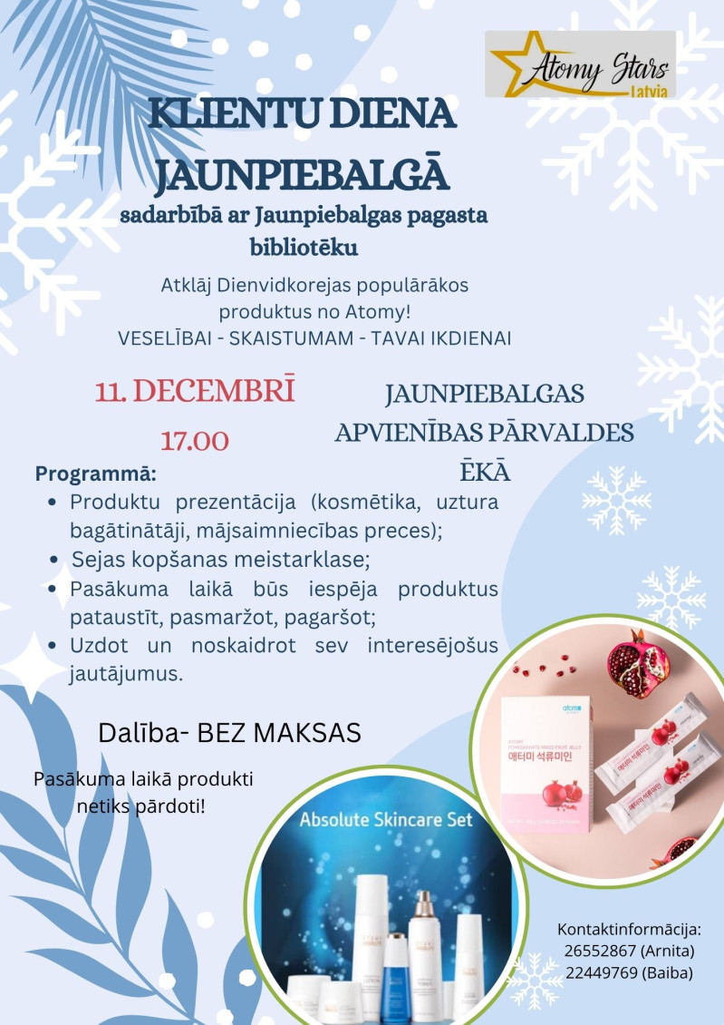 Ceturtdien, 11. decembrī, plkst. 17.00 Jaunpiebalgas apvienības pārvaldes zālē notiks klientu diena, kuras laikā būs iespēja iepazīties ar Dienvidkorejas populārākajiem produktiem no Atomy.