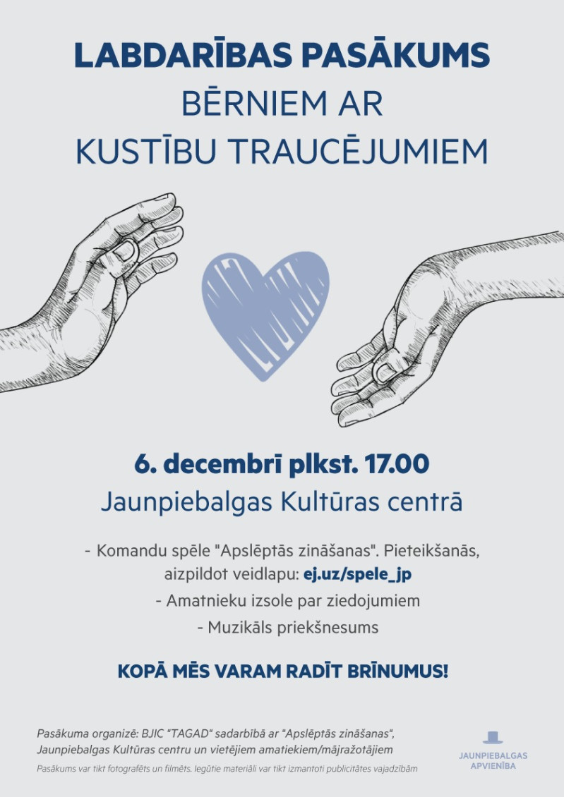 Sestdien, 6. decembrī, plkst. 17.00 Jaunpiebalgas Kultūras centrā notiks labdarības pasākums bērniem ar kustību traucējumiem.