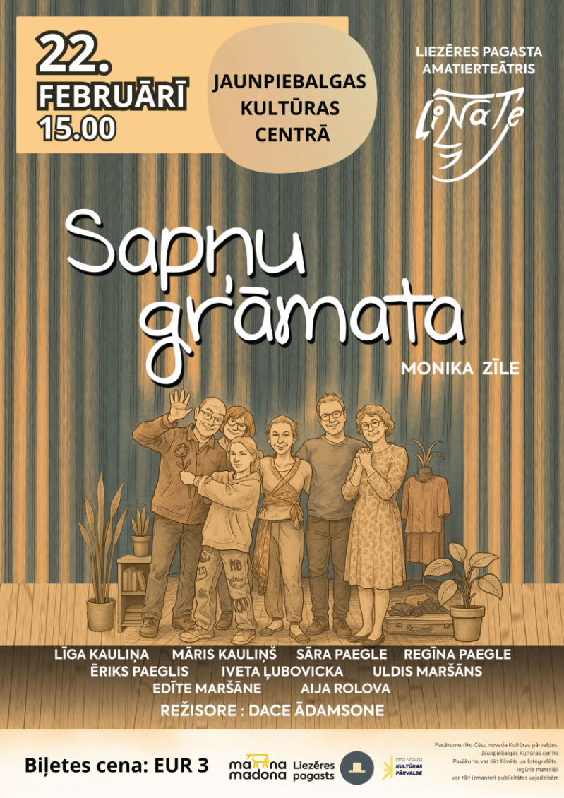 Svētdien, 22. februārī, plkst. 15.00 Jaunpiebalgas Kultūras centrā notiks Liezēres amatierteātra “LiNaTe” viesizrāde “Sapņu grāmata”.