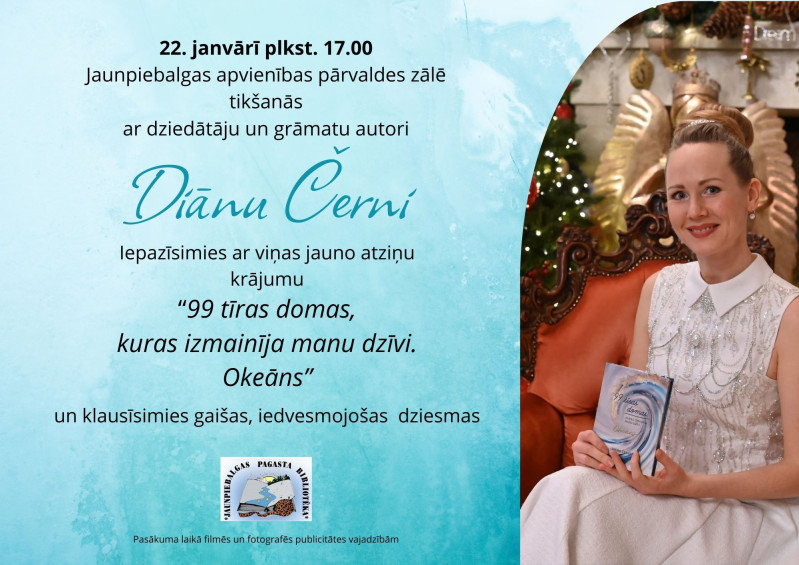 Ceturtdien, 22. janvārī, plkst. 17.00 Jaunpiebalgas apvienības pārvaldes zālē notiks tikšanās ar grāmatu autori un dziedātāju Diānu Černi.