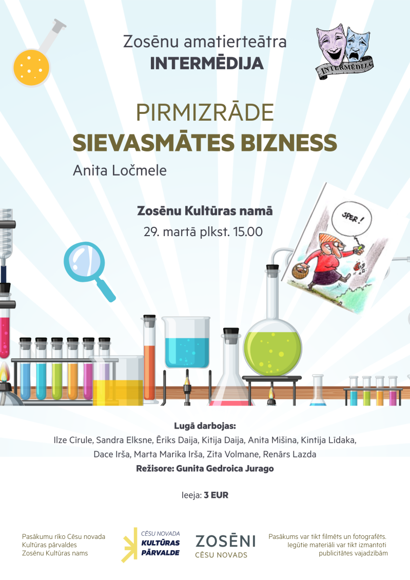 Svētdien, 29. martā, plkst. 15.00 Zosēnu Kultūras namā būs skatāma Zosēnu amatierteātra "Intermēdija" lugas "Sievasmātes bizness" (Anita Ločmele) pirmizrāde.