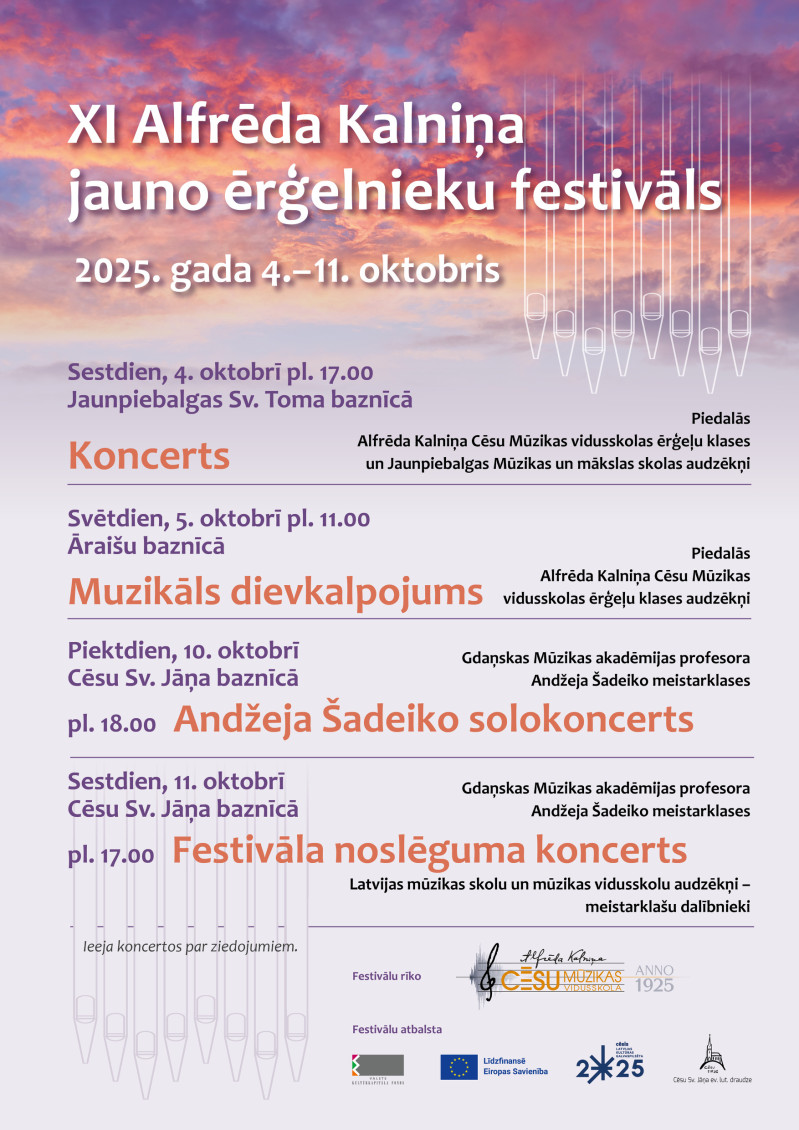 Šoruden no 4. oktobra līdz 11. oktobrim Cēsīs jau 11. reizi notiks Alfrēda Kalniņa jauno ērģelnieku festivāls, turpinot 2001. gadā aizsākto tradīciju - pulcēt mūzikas skolu un mūzikas vidusskolu jaunos ērģelniekus, lai bagātinātu viņu koncertpieredzi un veicinātu profesionālo izaugsmi, attīstītu pedagogu sadarbību, pieredzes un jaunu ideju apmaiņu. Viens no festivāla mērķiem ir vērst plašāku skatu uz ērģeļu kultūru tās daudzajās izpausmēs - instrumentu būvi, daudzveidīgu repertuāru, izpildītājmākslu un izglītības iespējām.