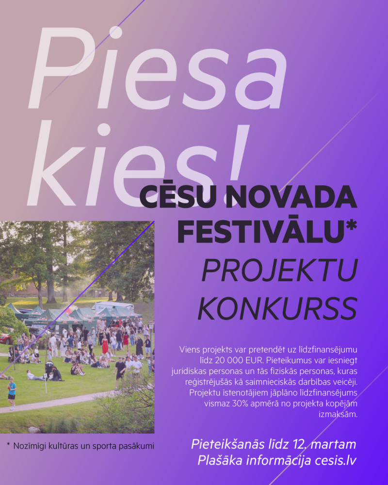 Cēsu novada pašvaldības iestāde "Kultūras pārvalde" 20. februārī izsludinājusi Cēsu novada festivālu, sabiedriski nozīmīgu kultūras un sporta pasākumu projektu konkursu.