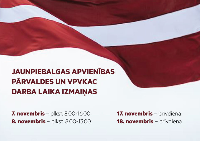 Informējam, ka novembra svētku laikā mainīts Jaunpiebalgas apvienības pārvaldes un VPVKAC darba laiks: