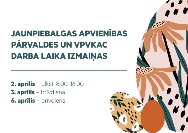 Informējam, ka aprīlī svētku laikā mainīts Jaunpiebalgas apvienības pārvaldes un Valsts un pašvaldību vienotā klientu apkalpošanas centra (VPVKAC) darba laiks: