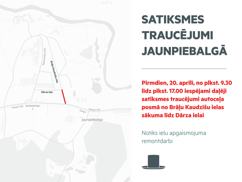 Pirmdien, 20. aprīlī, no plkst. 9.30 līdz plkst. 17.00 iespējami daļēji satiksmes traucējumi autoceļa posmā no Brāļu Kaudzīšu ielas sākuma līdz Dārza ielai.